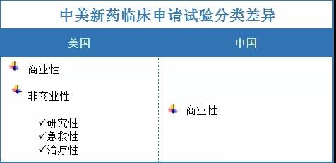 在美國,新藥臨床申請?jiān)囼?yàn)分為商業(yè)性和非商業(yè)性兩類。非商業(yè)性申請目的分為研究性、急救性、治療性新藥臨床試驗(yàn)申請,此類申請高于商業(yè)性申請。而我國新藥臨床研究申請主要目的是商業(yè)性的,即申請新藥通過臨床研究,最終投入生產(chǎn)銷售。