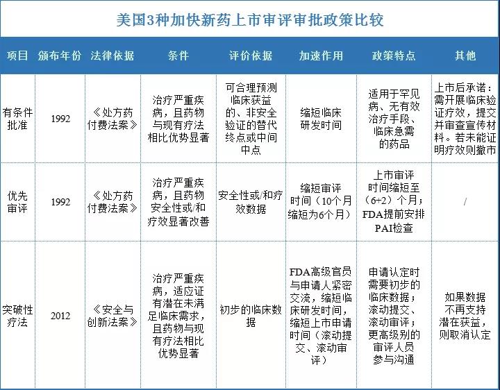 美國的新藥上市加快審評審批的政策有3種,分別是突破性療法(breakthrough therapy)、優(yōu)先審評( priority review)、有條件批準(zhǔn)(accelerated approval)。