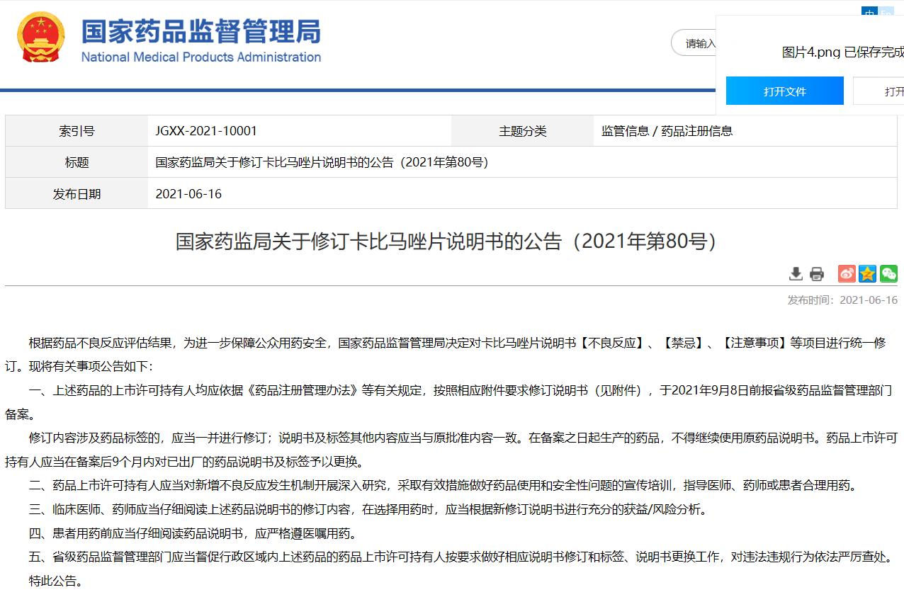 國(guó)家藥監(jiān)局關(guān)于修訂卡比馬唑片說(shuō)明書(shū)的公告(2021年第80號(hào))
