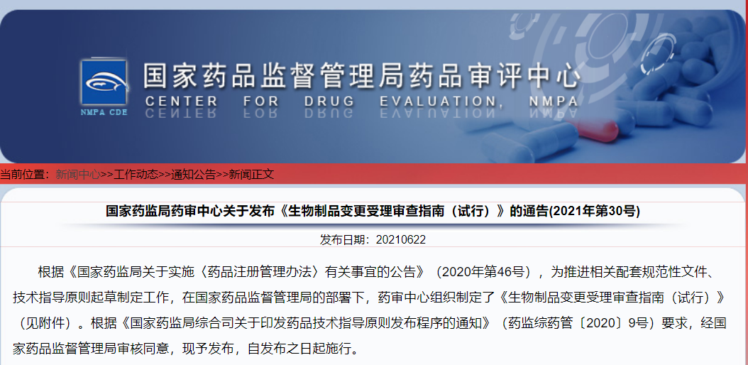 國家藥監(jiān)局藥審中心關(guān)于發(fā)布《生物制品變更受理審查指南(試行)》的通告(2021年第30號)