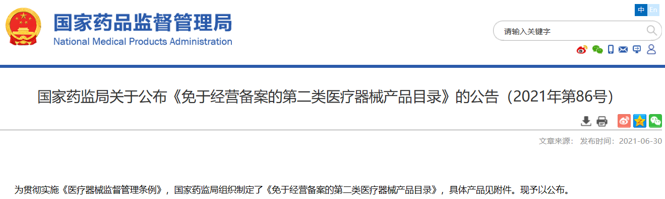 關(guān)于公布《免于經(jīng)營(yíng)備案的第二類(lèi)醫(yī)療器械產(chǎn)品目錄》的公告(2021年第86號(hào))