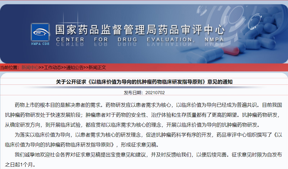 關(guān)于公開(kāi)征求《以臨床價(jià)值為導(dǎo)向的抗腫瘤藥物臨床研發(fā)指導(dǎo)原則》意見(jiàn)的通知