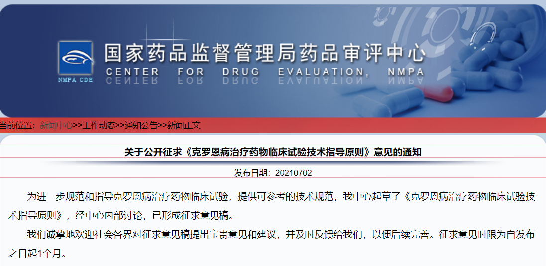 關(guān)于公開(kāi)征求《克羅恩病治療藥物臨床試驗(yàn)技術(shù)指導(dǎo)原則》意見(jiàn)的通知
