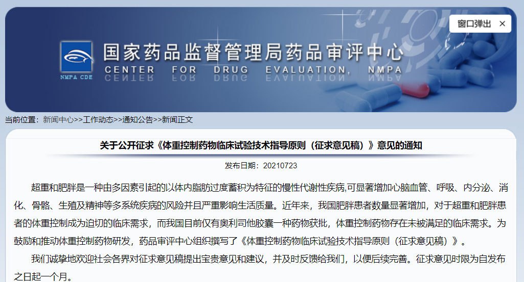 關(guān)于公開(kāi)征求《體重控制藥物臨床試驗(yàn)技術(shù)指導(dǎo)原則(征求意見(jiàn)稿)》意見(jiàn)的通知