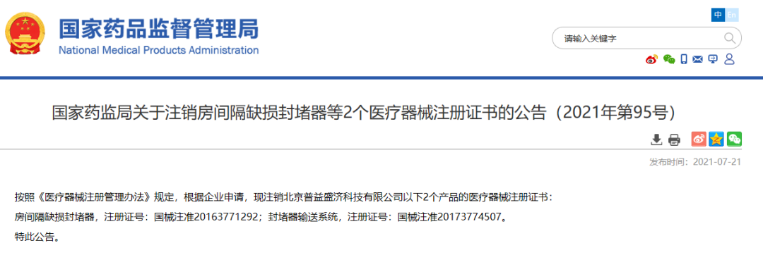 關(guān)于注銷(xiāo)房間隔缺損封堵器等2個(gè)醫(yī)療器械注冊(cè)證書(shū)的公告(2021年第95號(hào))