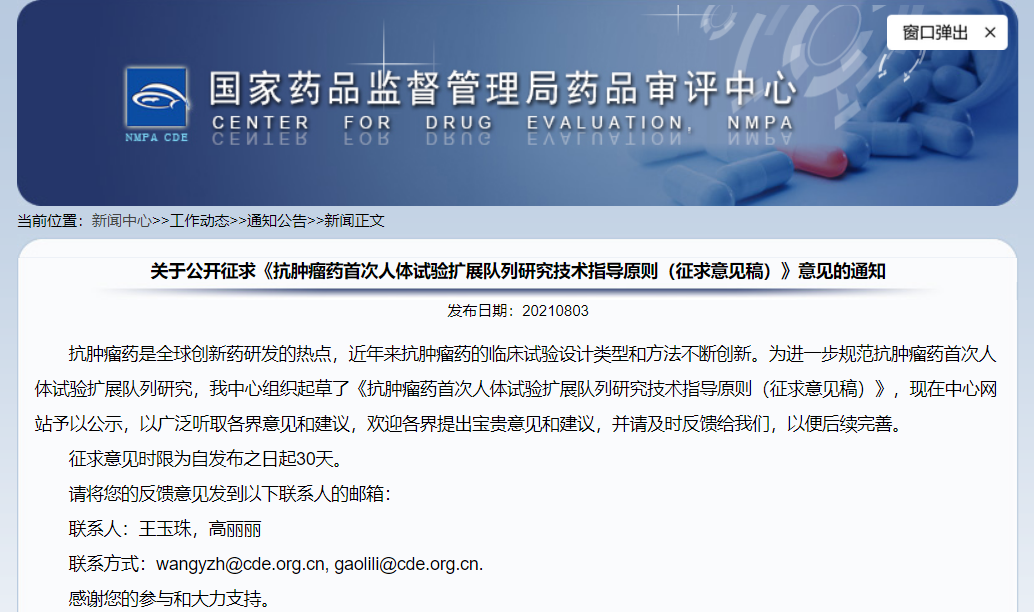關于公開征求《抗腫瘤藥首次人體試驗擴展隊列研究技術(shù)指導原則(征求意見稿)》意見的通知