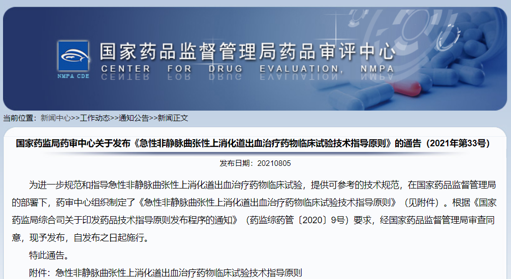 關于發(fā)布《急性非靜脈曲張性上消化道出血治療藥物臨床試驗技術(shù)指導原則》的通告(2021年第33號)