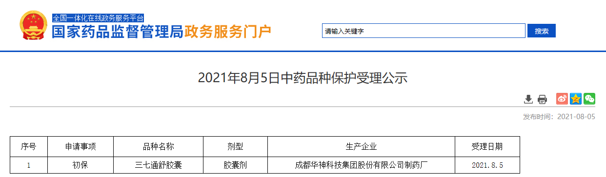 2021年8月5日中藥品種保護受理公示