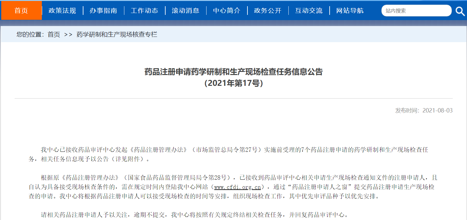 藥品注冊申請藥學研制和生產(chǎn)現(xiàn)場檢查任務信息公告(2021年第17號)