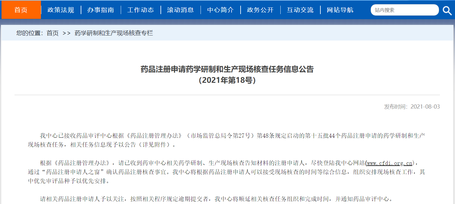 藥品注冊申請藥學研制和生產(chǎn)現(xiàn)場核查任務信息公告(2021年第18號)