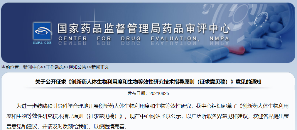 關(guān)于公開(kāi)征求《創(chuàng)新藥人體生物利用度和生物等效性研究技術(shù)指導(dǎo)原則(征求意見(jiàn)稿)》意見(jiàn)的通知