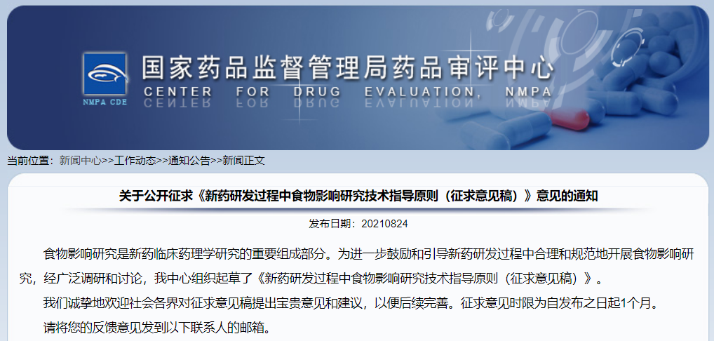 關(guān)于公開(kāi)征求《新藥研發(fā)過(guò)程中食物影響研究技術(shù)指導(dǎo)原則(征求意見(jiàn)稿)》意見(jiàn)的通知