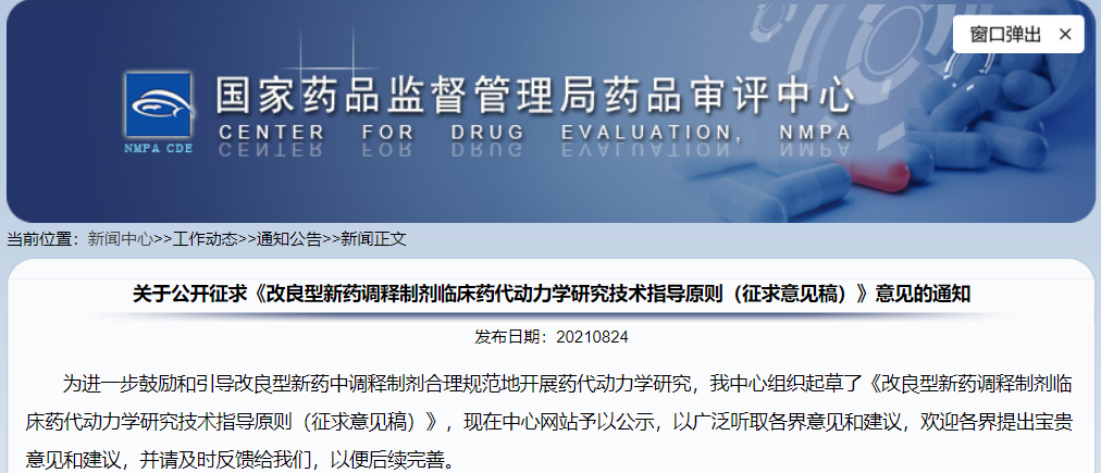 關(guān)于公開(kāi)征求《改良型新藥調(diào)釋制劑臨床藥代動(dòng)力學(xué)研究技術(shù)指導(dǎo)原則(征求意見(jiàn)稿)》意見(jiàn)的通知