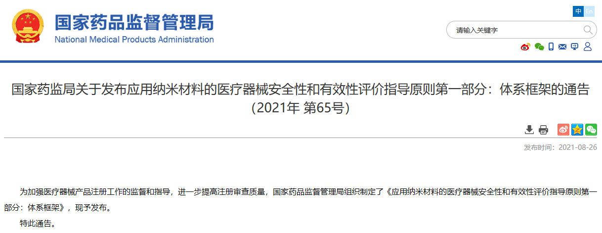 關(guān)于發(fā)布應(yīng)用納米材料的醫(yī)療器械安全性和有效性評(píng)價(jià)指導(dǎo)原則第一部分:體系框架的通告(2021年 第65號(hào))