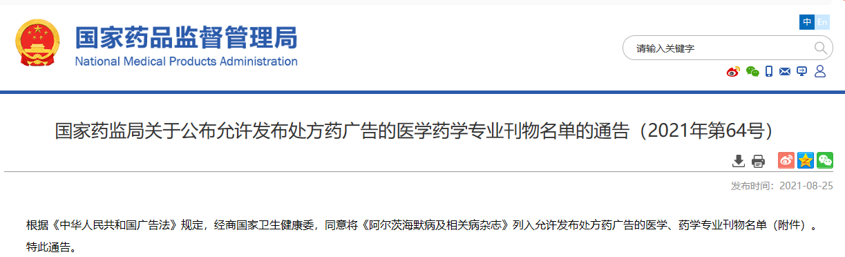 關(guān)于公布允許發(fā)布處方藥廣告的醫(yī)學(xué)藥學(xué)專(zhuān)業(yè)刊物名單的通告(2021年第64號(hào))