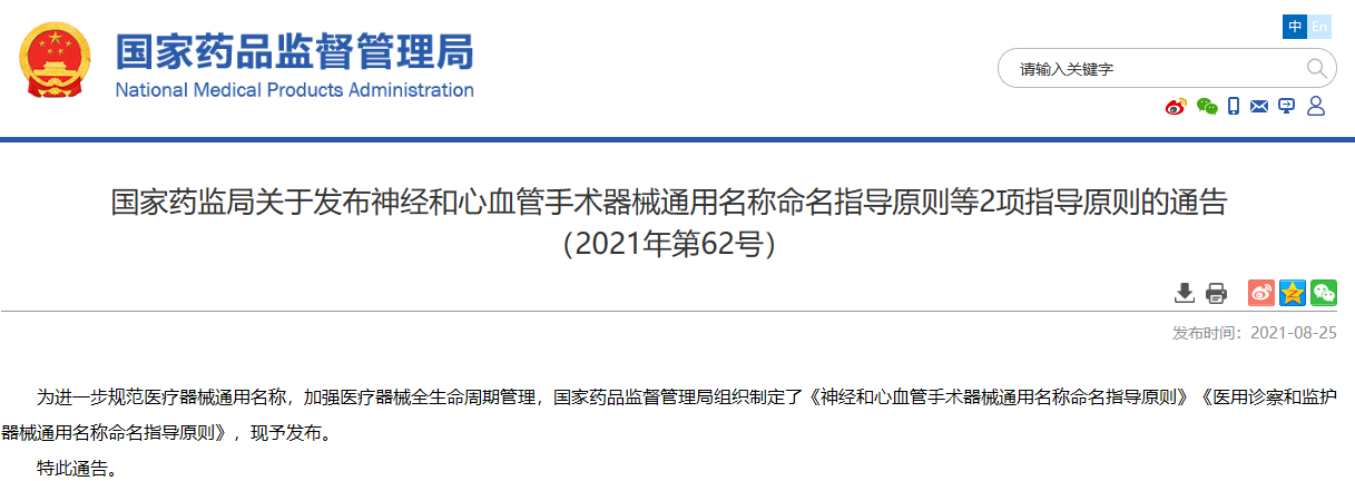 關(guān)于發(fā)布神經(jīng)和心血管手術(shù)器械通用名稱(chēng)命名指導(dǎo)原則等2項(xiàng)指導(dǎo)原則的通告(2021年第62號(hào))