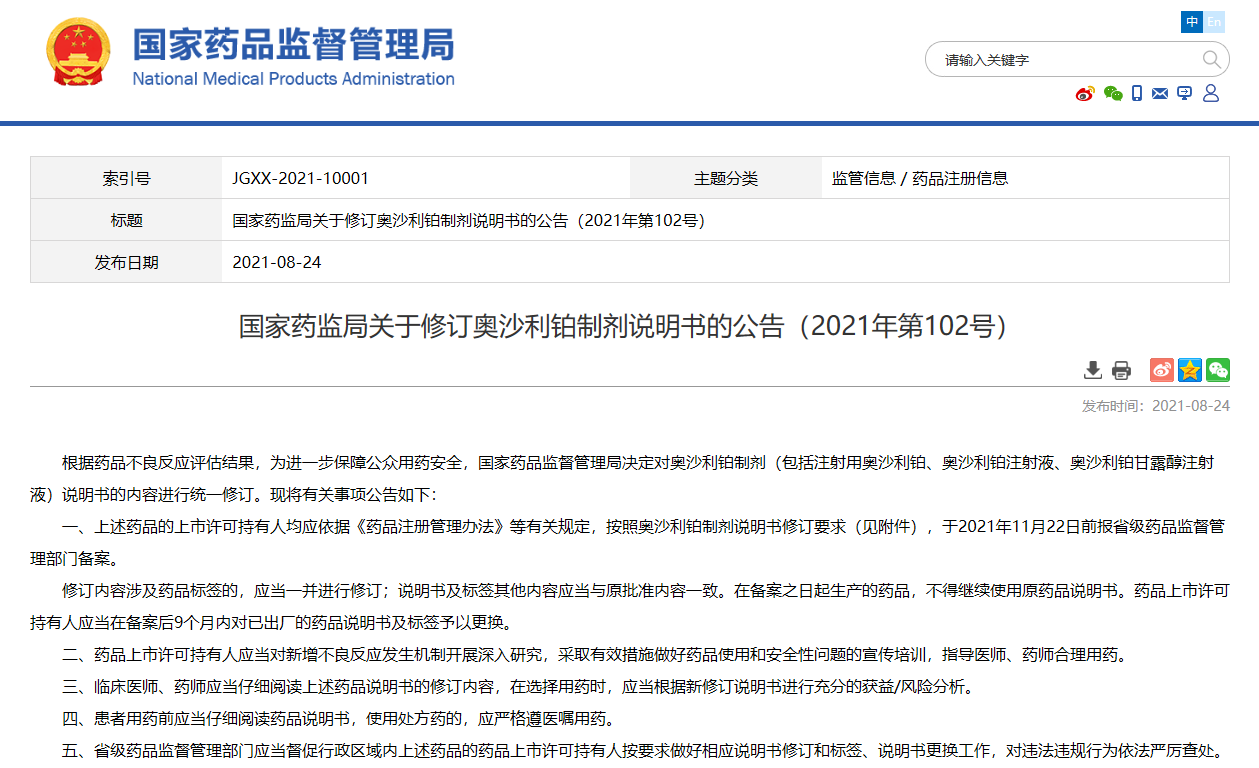 關(guān)于修訂奧沙利鉑制劑說(shuō)明書(shū)的公告(2021年第102號(hào))