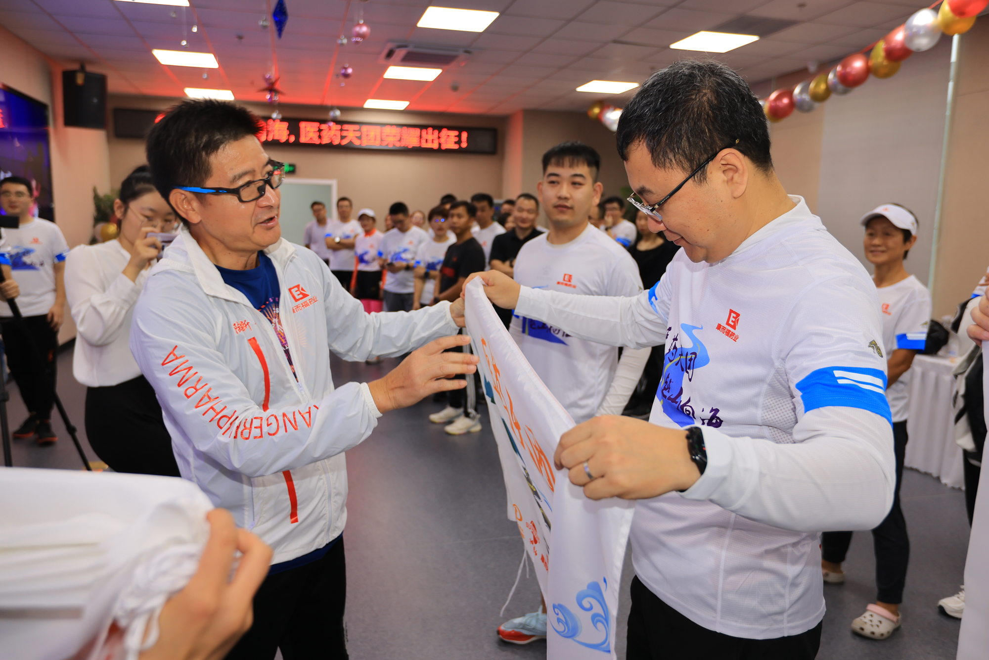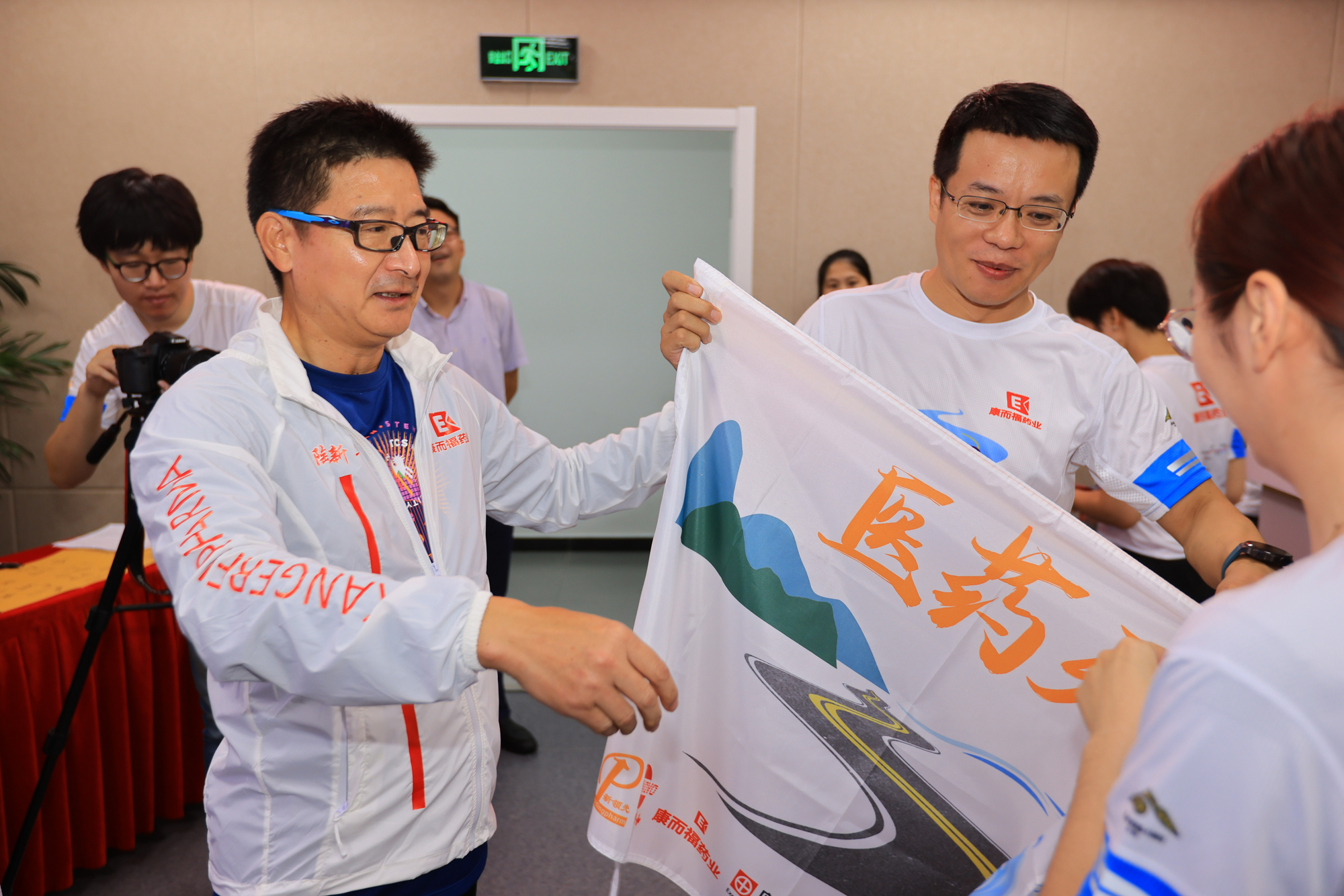▲醫(yī)藥天團(tuán)越山向海發(fā)起人、新領(lǐng)先醫(yī)藥董事長陶新華先生分別向各戰(zhàn)隊(duì)授予“醫(yī)藥天團(tuán)”旗幟