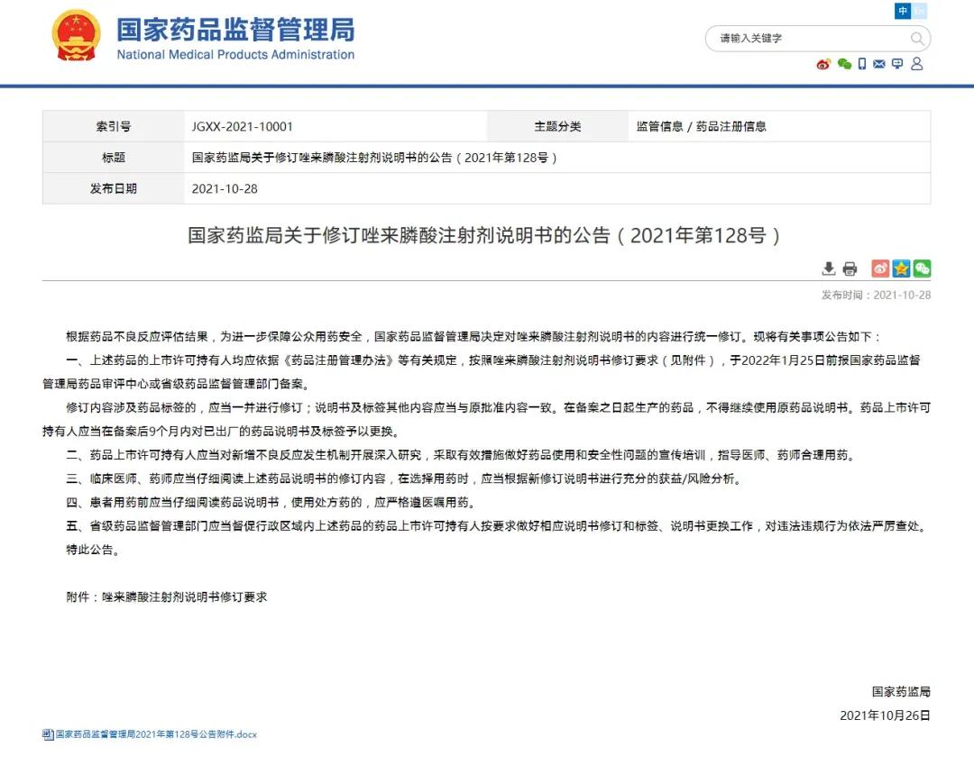 國(guó)家藥監(jiān)局關(guān)于修訂唑來(lái)膦酸注射劑說(shuō)明書(shū)的公告(2021年第128號(hào))
