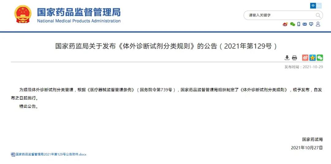 國(guó)家藥監(jiān)局關(guān)于發(fā)布《體外診斷試劑分類(lèi)規(guī)則》的公告(2021年第129號(hào))