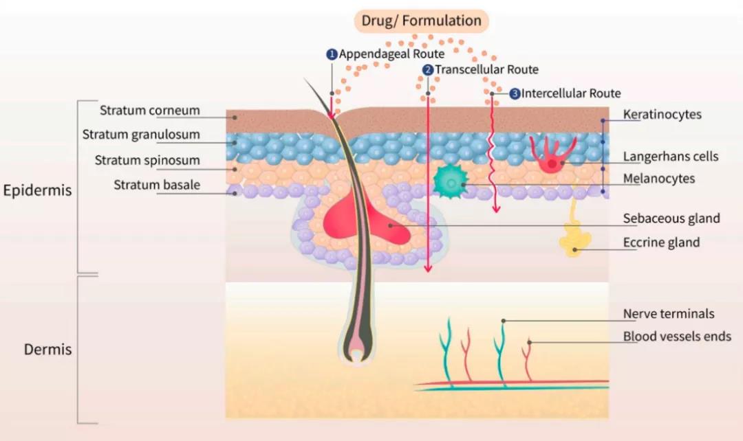 Figure1. 皮膚構(gòu)造組成與透皮制劑的釋藥路徑