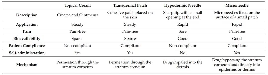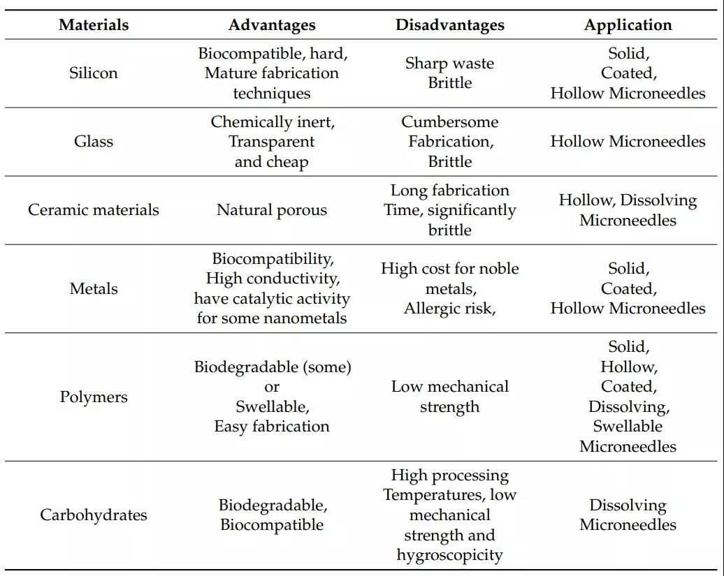 Figure6. 不同材料的微針制劑技術(shù)優(yōu)劣比較
