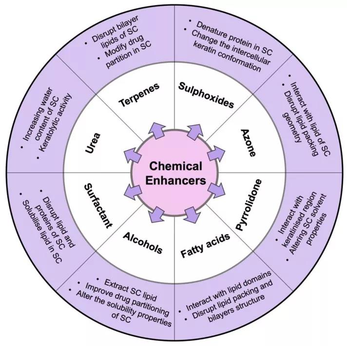 圖5為我們展示了在化學促滲技術(shù)中較常使用的物質(zhì),包括醇類,脂肪酸,吡咯烷酮,氮酮,亞砜,表面活性劑,尿素和萜烯類化合物。這些化合物的作用機理常常是改變皮下組織的理化性質(zhì),比如改變水油分配比,改變磷脂層的結(jié)構(gòu),失活相應(yīng)調(diào)控蛋白,進一步地,使得藥物活性成分進入人體吸收的比例增加[3]。