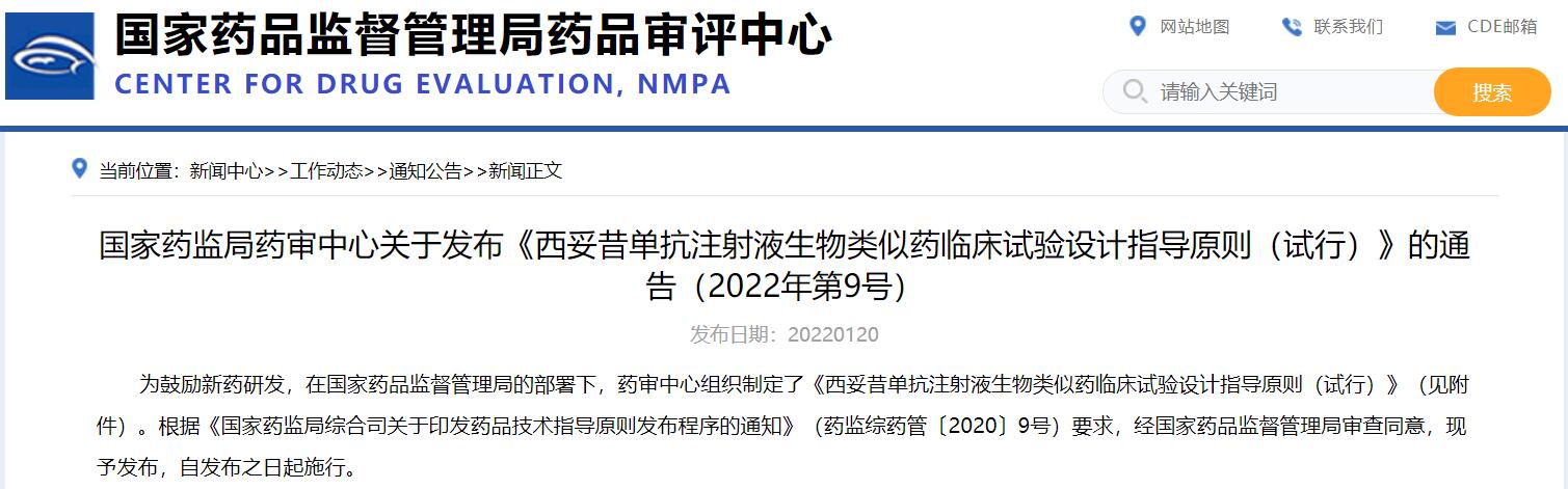 國家藥監(jiān)局藥審中心關(guān)于發(fā)布《西妥昔單抗注射液生物類似藥臨床試驗設(shè)計指導原則(試行)》的通告(2022年第9號)