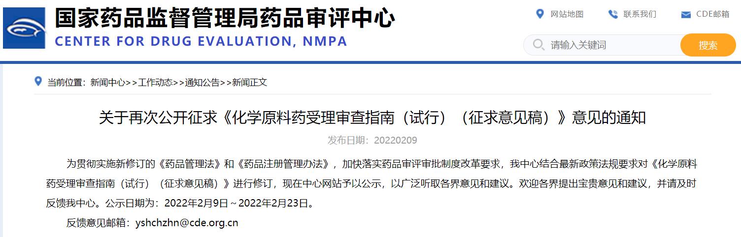 關(guān)于再次公開征求《化學(xué)原料藥受理審查指南(試行)(征求意見稿)》意見的通知
