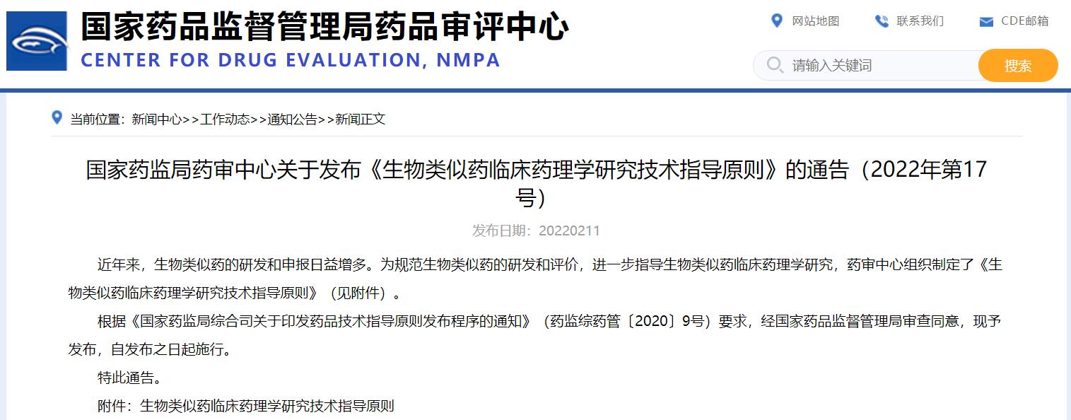 國家藥監(jiān)局藥審中心關(guān)于發(fā)布《生物類似藥臨床藥理學(xué)研究技術(shù)指導(dǎo)原則》的通告(2022年第17號)