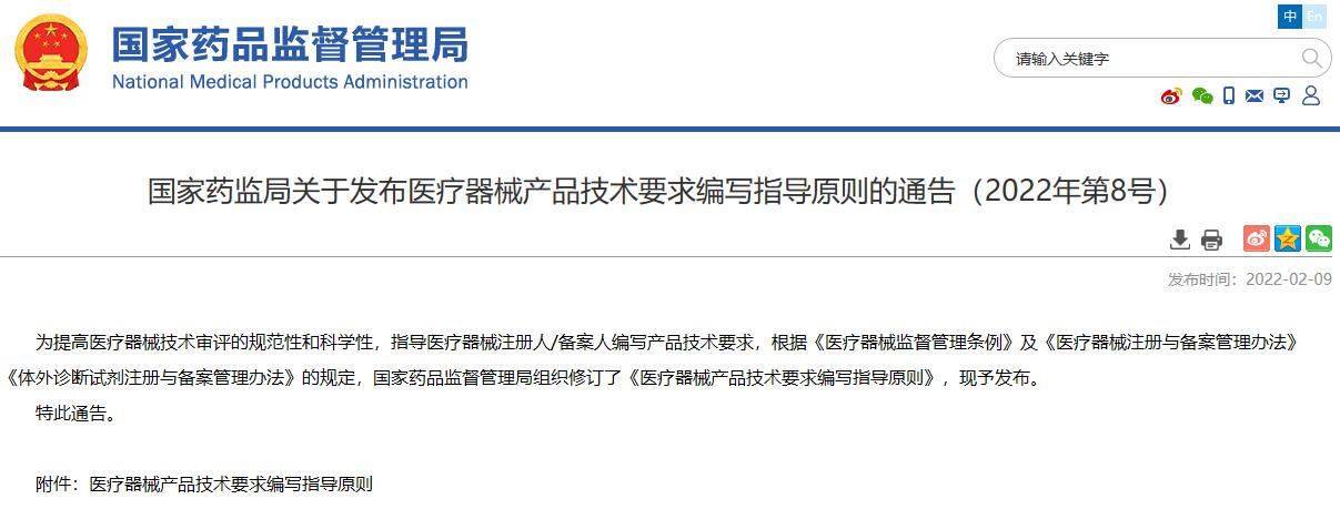 國家藥監(jiān)局關(guān)于發(fā)布醫(yī)療器械產(chǎn)品技術(shù)要求編寫指導(dǎo)原則的通告(2022年第8號)