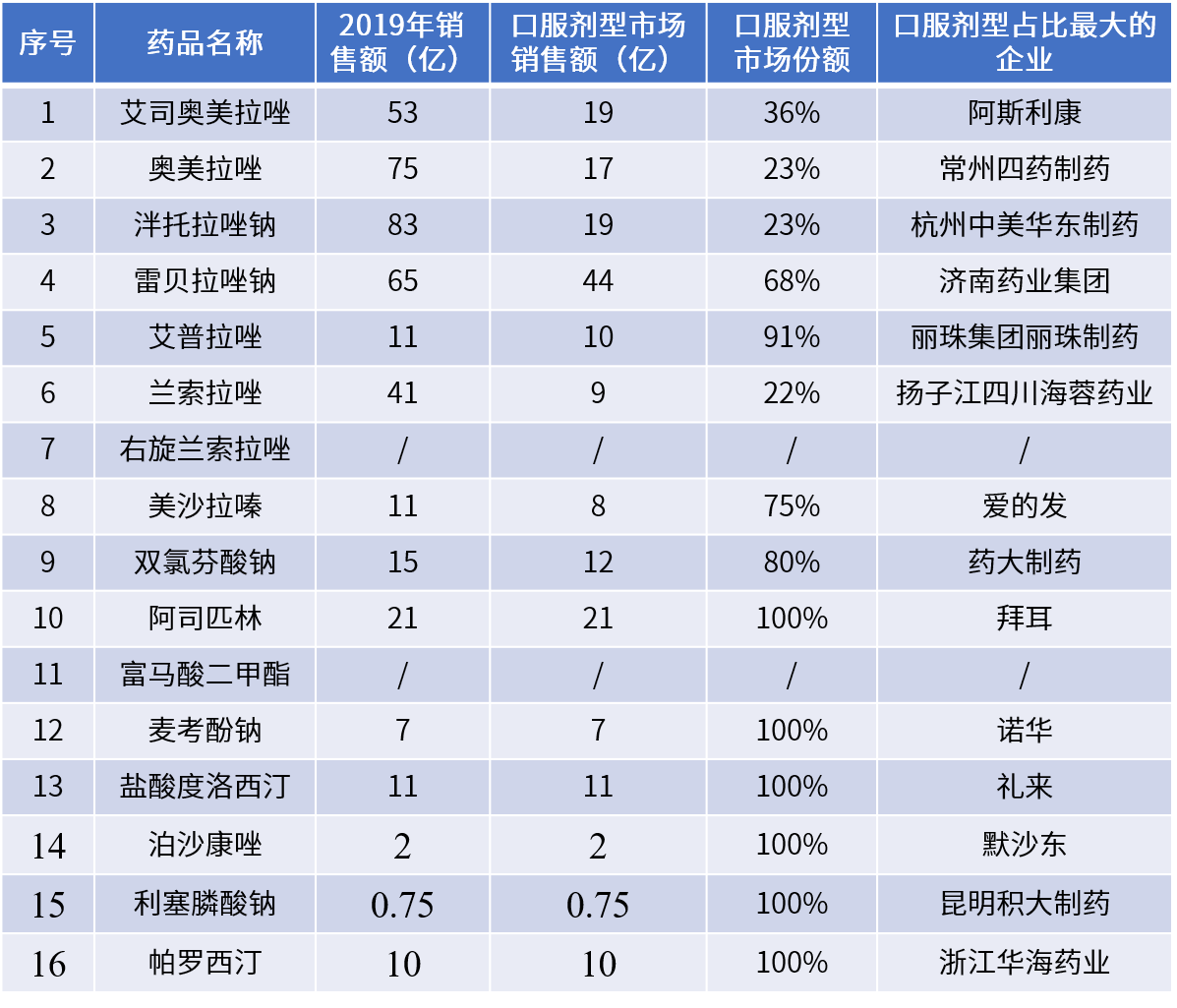 腸溶制劑憑借其獨(dú)特的臨床優(yōu)勢,誕生了數(shù)個(gè)重磅產(chǎn)品,如質(zhì)子泵抑制劑類,心血管疾病一線治療藥物阿司匹林腸溶片,新型抗真菌藥物泊沙康唑腸溶片和腸溶干混懸劑以及抑郁市場主力產(chǎn)品度洛西汀腸溶膠囊等。
