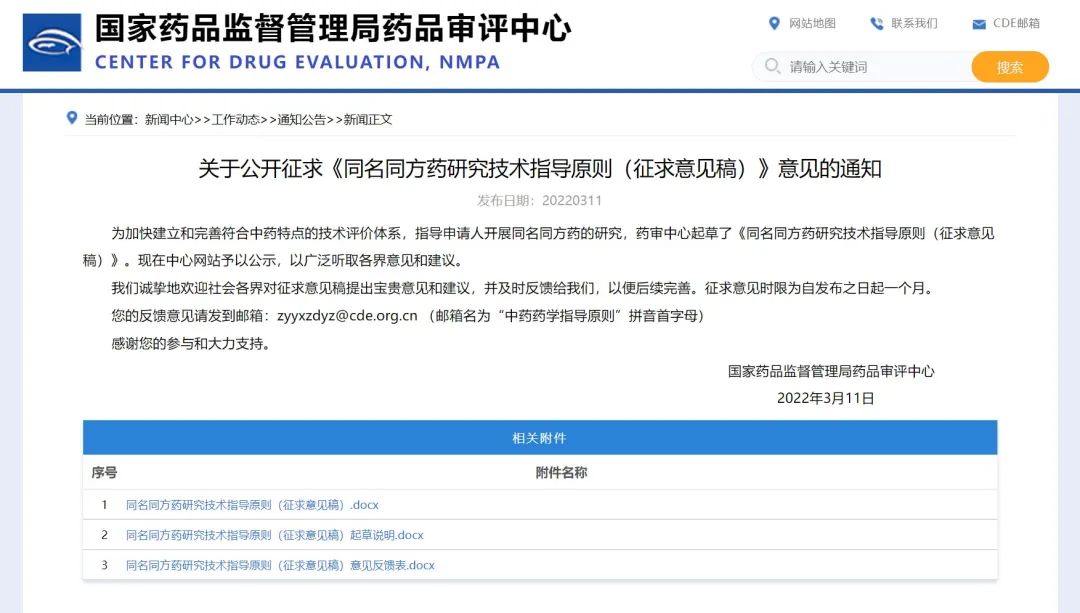 關(guān)于公開征求《同名同方藥研究技術(shù)指導原則(征求意見稿)》意見的通知