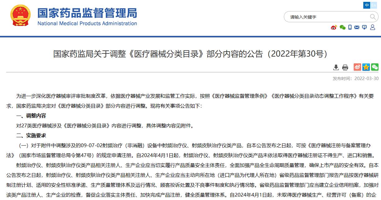國家藥監(jiān)局關(guān)于調(diào)整《醫(yī)療器械分類目錄》部分內(nèi)容的公告(2022年第30號)