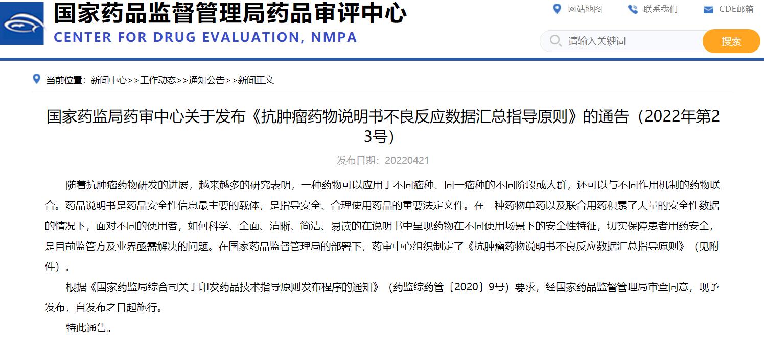 國家藥監(jiān)局藥審中心關(guān)于發(fā)布《抗腫瘤藥物說明書不良反應(yīng)數(shù)據(jù)匯總指導(dǎo)原則》的通告(2022年第23號)