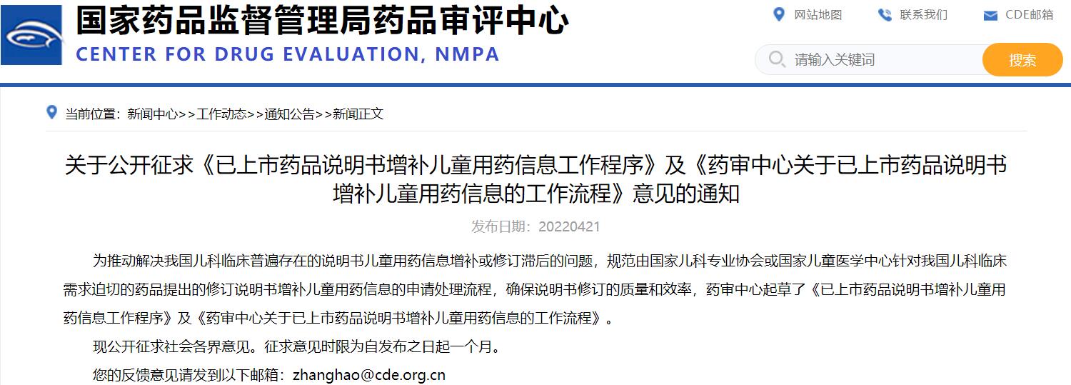 關(guān)于公開征求《已上市藥品說明書增補兒童用藥信息工作程序》及《藥審中心關(guān)于已上市藥品說明書增補兒童用藥信息的工作流程》意見的通知