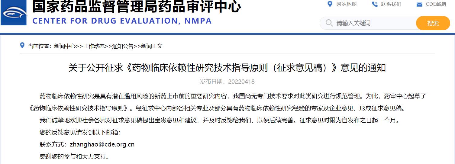 關(guān)于公開征求《藥物臨床依賴性研究技術(shù)指導(dǎo)原則(征求意見稿)》意見的通知
