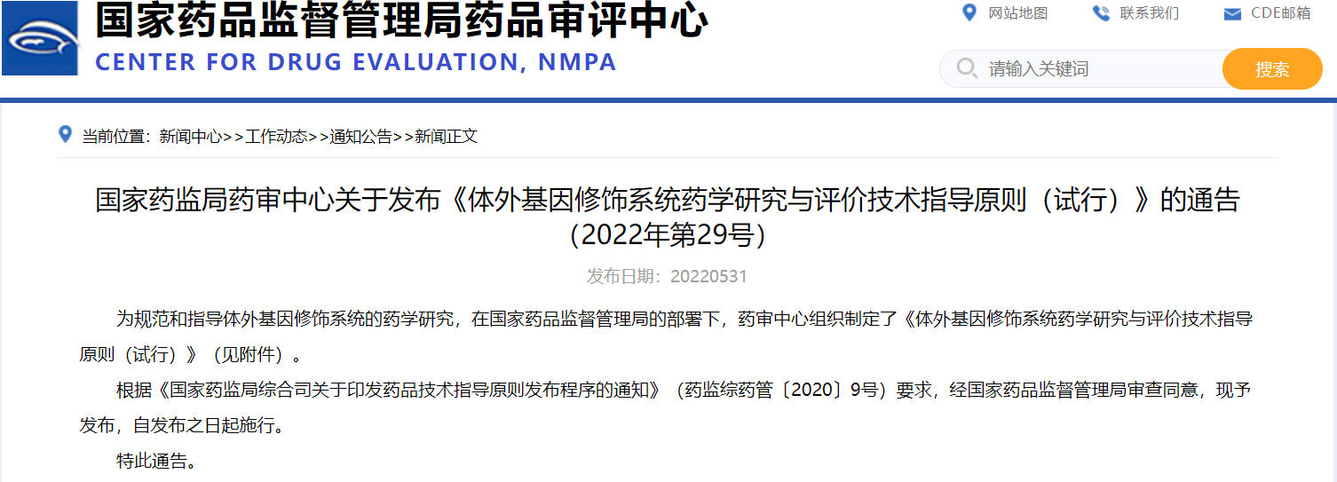 國家藥監(jiān)局藥審中心關于發(fā)布《體外基因修飾系統(tǒng)藥學研究與評價技術指導原則(試行)》的通告(2022年第29號)