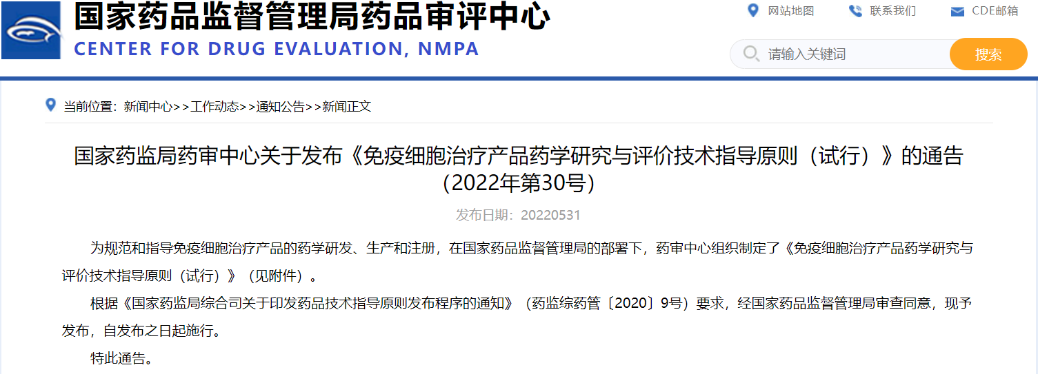 國家藥監(jiān)局藥審中心關于發(fā)布《免疫細胞治療產品藥學研究與評價技術指導原則(試行)》的通告(2022年第30號)