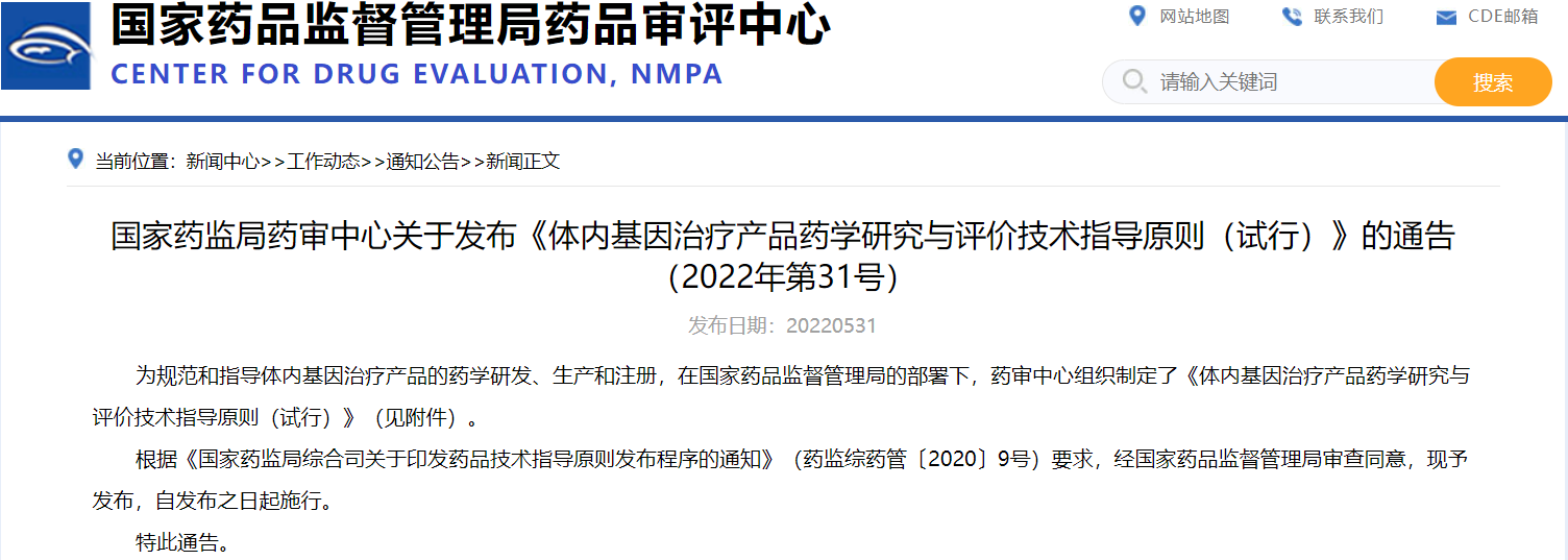 國家藥監(jiān)局藥審中心關于發(fā)布《體內基因治療產品藥學研究與評價技術指導原則(試行)》的通告(2022年第31號)