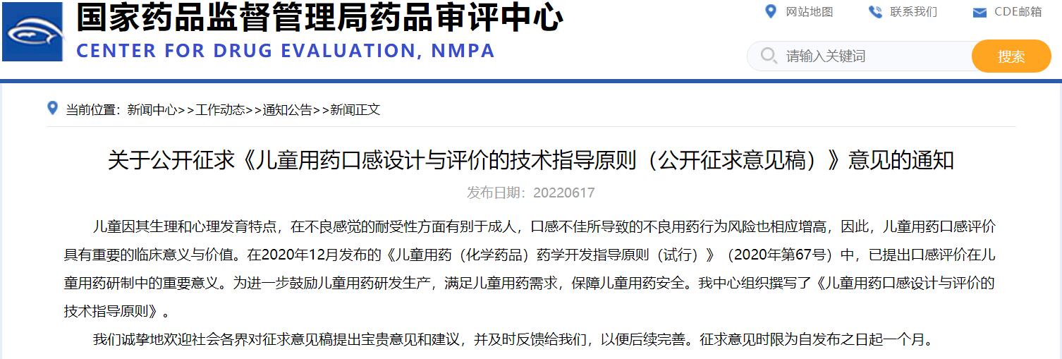 國家藥監(jiān)局藥審中心關(guān)于公開征求《兒童用藥口感設(shè)計(jì)與評(píng)價(jià)的技術(shù)指導(dǎo)原則(公開征求意見稿)》意見的通知