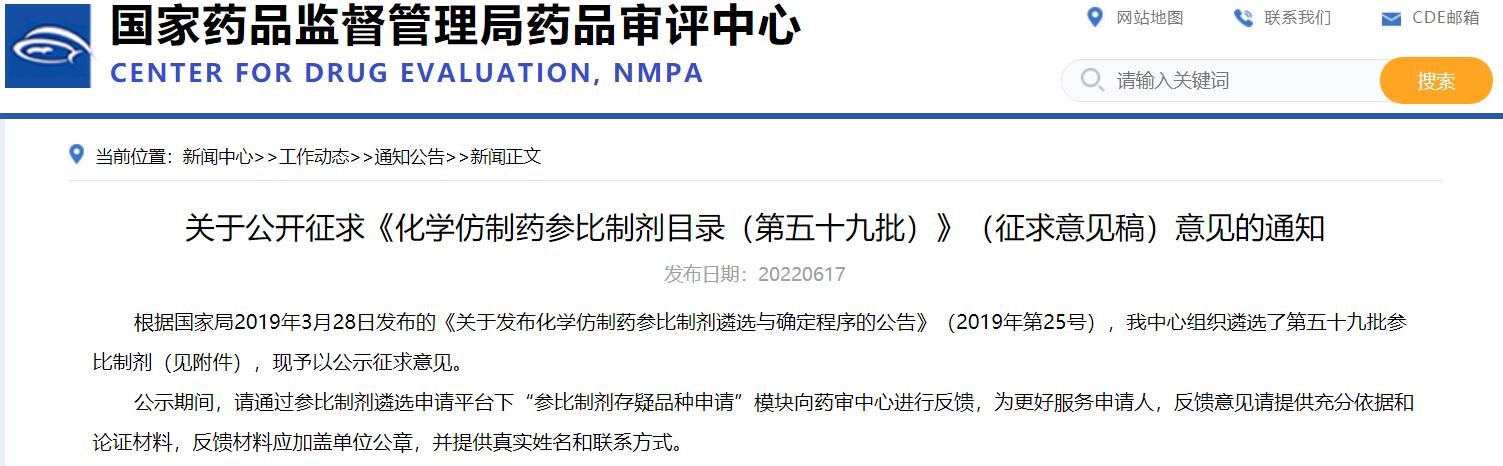 關(guān)于公開征求《化學(xué)仿制藥參比制劑目錄(第五十九批)》(征求意見稿)意見的通知