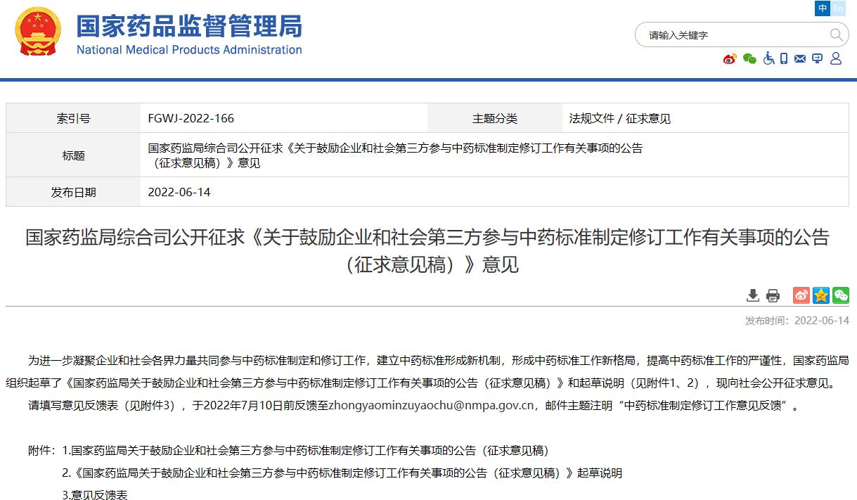 國家藥監(jiān)局綜合司公開征求《關(guān)于鼓勵(lì)企業(yè)和社會(huì)第三方參與中藥標(biāo)準(zhǔn)制定修訂工作有關(guān)事項(xiàng)的公告(征求意見稿)》意見