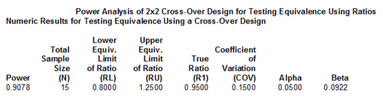 試驗設計為:交叉、兩制劑、兩周期;假設檢驗的顯著性水平(Alpha)設置為 0.05,試驗設計的把握度(Power)為 0.8,T/R 比值設定為 0.95,等效界值設定為 80.00%-125.00%,分別以個體內變異為 15% 和 30% 為例,進行計算,結果如下: