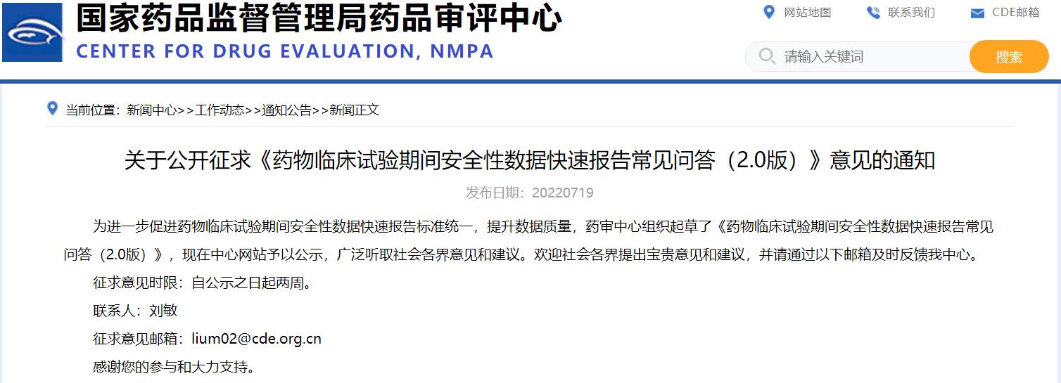 關(guān)于公開征求《藥物臨床試驗(yàn)期間安全性數(shù)據(jù)快速報(bào)告常見問答(2.0版)》意見的通知