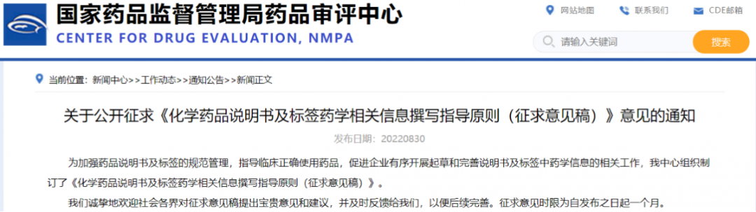 關(guān)于公開征求《化學(xué)藥品說明書及標(biāo)簽藥學(xué)相關(guān)信息撰寫指導(dǎo)原則(征求意見稿)》意見的通知