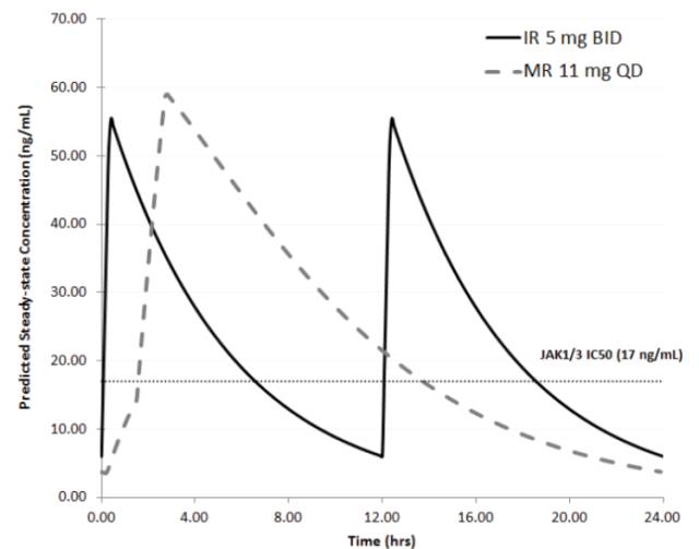 ·多劑量研究中(連續(xù)服用5天),托法替布緩釋片11mg(qd)與托法替布片5mg(bid),開展BE試驗。