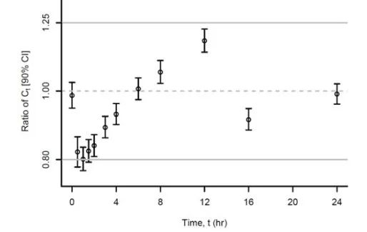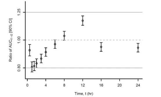 除此之外,該試驗中也分析了不同時間段,兩種制劑藥動學(xué)的差異,如圖所示: