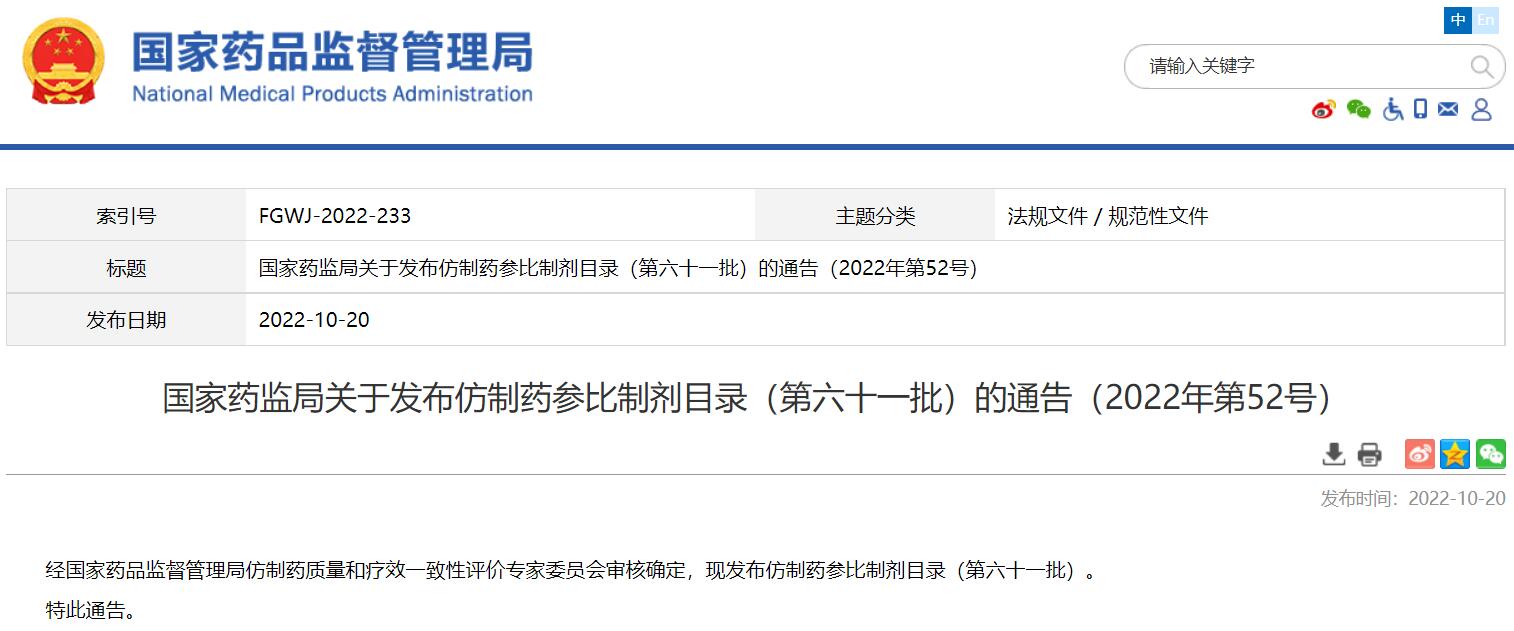 國家藥監(jiān)局關(guān)于發(fā)布仿制藥參比制劑目錄(第六十一批)的通告(2022年第52號)