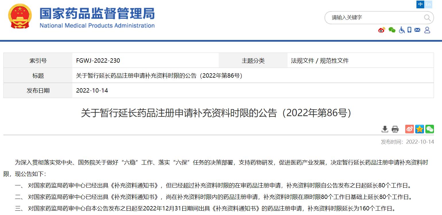 關(guān)于暫行延長藥品注冊申請補(bǔ)充資料時(shí)限的公告(2022年第86號)